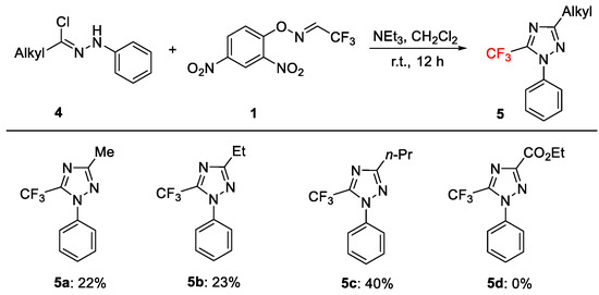 Next, we attempted the cycloaddition of alkyl-substituted hydrazonyl chlorides 4 with 1 (Figure 4). Under the optimized conditions, both methyl, ethyl, and n-propyl-substituted hydrazonyl chlorides furnished the desired products, 5a–5c, in only moderate yields (22–40%), which could be a result of the inherent instability of the hydrazonyl chloride substrates with an alkyl substituent. However, ester-substituted hydrazonyl chloride 4d did not result in the desired cyclized product, 5d, under our standard or modified reaction conditions, probably due to the resulting decreased nucleophilicity of the nitrogen atom through the conjugated system from the nitrile imine intermediates.