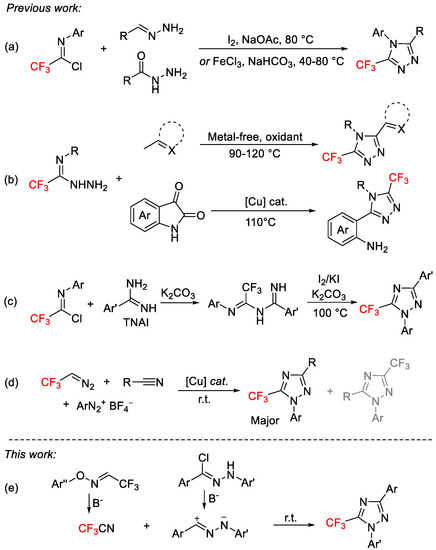 - Du, S.; Wang, L.C.; Yang, Z.; Chen, Z.; Wu, X.F. A Convenient FeCl3-Mediated Synthesis of 5-Trifluoromethyl-1,2,4-triazoles from Trifluoroacetimidoyl Chlorides and Hydrazides. Adv. Synth. Catal. 2020, 362, 5130–5134. [Google Scholar] [CrossRef]