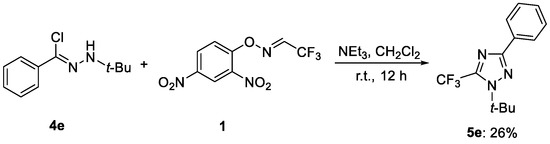 Nevertheless, a hydrazonyl chloride with a t-butyl substituent on the nitrogen atom reacted with 1 to produce the corresponding product, 5e, in a 26% yield (Scheme 2).