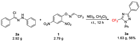 Our study commenced by choosing N-phenyl-benzohydrazonoyl chloride, 2a, and trifluoroacetaldehyde O-(2,4-dinitrophenyl) oxime, 1, as the model substrates (Table 1), using our previously reported optimized conditions for the synthesis of trifluoromethylated oxadiazoles [38]. To our delight, the reaction of 2a with 1 in a 1:2 ratio in the presence of 2.0 equiv of NEt3 afforded the desired product, 5-trifluoromethyl 1,2,4-triazole, 3a, in 3% and 8% yields in THF and DMSO, respectively (Entries 1 and 2). Among other solvents (Entries 3–6), the reaction worked best in CH2Cl2 (Entry 5), whereas in toluene, the reaction could not proceed (Entry 6). Notably, upon increasing the amount of 2a and keeping the other parameters constant, the yield of 3a was further improved (37% and 49% with 2a and 1 in 1:1 and 2:1 ratios, respectively; Entries 7 and 8). Gratifyingly, the yield of 3a was further improved to 75% by increasing the amount of NEt3 (3.0 equiv) (Entry 9). The best yield (83%) was obtained with the reaction of 2a with 1 in a 1.5:1 ratio in the presence of 3.0 equiv of NEt3 in CH2Cl2 (Entry 10).