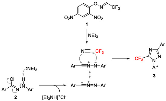 Based on the results obtained from these experiments and literature reports [38,43], a plausible mechanism for the formation of 5-trifluoromethyl 1,2,4-triazole (3) was proposed (Scheme 5). The nitrile imine generated in situ from hydrazonyl chloride 2 in the presence of a base underwent regioselective [3 + 2] cycloaddition with the in situ-generated CF3CN from 1 to generate the desired product, 3.