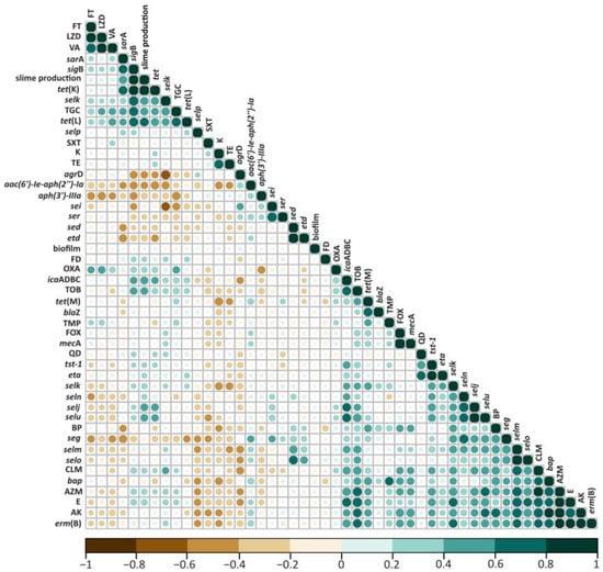 To systematically detect all such associations in an unbiased way, we analyzed all potential pairs of variables (except those that were entirely present or completely absent among all (n = 93) isolates. Among the observed correlations, we found positive correlations between the ability of the strains to form biofilm and phenotypic resistance to all the antibiotics tested. Interestingly, we found negative correlations between slime production and phenotypic resistance to trimethoprim, kanamycin, and quinupristin/dalfopristin (Figure 1).