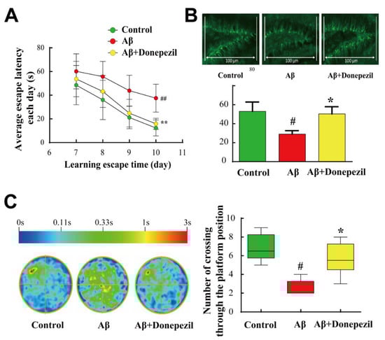 The Morris water maze (MWM) test was performed sequentially for four days. Donepezil treatment of Aβ-injected mice significantly reduced escape latency and the number of platform area crossings in mice compared to the Aβ group. Donepezil treatment of Aβ-injected mice resulted in a 3-fold decrease in escape latency of mice on the 10th day and a 2-fold increase in the crossing time in the probe test compared to Aβ25–35 treatment only, implying the successful elevation of memory performance by donepezil against Aβ25–35 induced neurodegeneration (Figure 1A). The spatial learning and memory ability of mice is closely related to the physiology of the hippocampus, which is essential for the neuroprocessing ability of mice [18]. Among the many anatomical parts of the hippocampus, the dentate gyrus is commonly studied and plays a key role in the formation, recall, and discrimination of episodic memory [19,20].