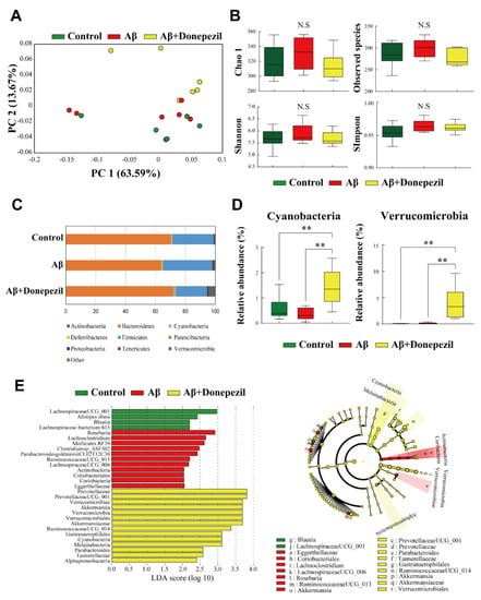 (A) Beta diversity analysis of the control, Aβ, and Aβ + donepezil groups based on weighted UniFrac distance matrices. (B) Alpha diversity analysis of the control, Aβ, and Aβ + donepezil groups. (C) Comparison of microbiota composition at the phylum level. (D) Relative abundance of cyanobacteria and Verrucomicrobia. (E) Linear discriminant analysis (LDA) and the cladogram show the phylogenetic distribution of microbes that are associated with the control, Aβ, and Aβ + donepezil groups. Taxonomic levels of the phylum, class, and order are labeled, while family and genus are abbreviated. Plots are represented using LDA effect size (LEfSe). **, p < 0.01.