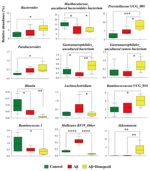 Box plots of significantly different microorganisms at the genus level in the feces of the control, Aβ, and Aβ + donepezil groups. The p values were obtained using one-way analysis of variance (ANOVA) with Tukey’s posthoc test for differences between groups; *, p < 0.05; **, p < 0.01; ***, p < 0.001; ****, p < 0.0001. A false discovery rate (FDR) of 5% was applied to all tests to correct for multiple testing.