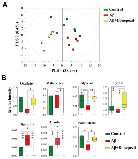 PLS-DA for supervised pattern recognition was applied to investigate different metabolite profiles and identify potential biomarkers (Figure 4A). The PLS-DA model showed a clear separation between the groups, suggesting that the changes in metabolites in the feces after each treatment differed between the groups. A permutation test supported the validity of the PLS-DA model. Among the 36 metabolites detected in fecal samples, those that significantly contributed to the discrimination were identified according to a threshold of VIP > 1.0, p < 0.05. The level of glycerol was significantly higher in the control group than that in the Aβ group (Figure 4B). The Aβ + donepezil group showed higher levels of oxalate, glycerol, xylose, and palmitoleate than the Aβ group, whereas the levels of malonic acid, hippurate, and allantoin were higher in the Aβ group than in the Aβ + donepezil group.