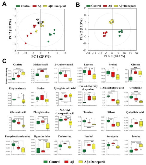 PCA was performed to investigate the different metabolite profiles in the brain tissue (Figure 5A). In the PCA score plot, the Aβ and Aβ + donepezil groups were well separated from the control, indicating that there was a significant metabolite difference between the groups. To maximize the separation and identify potential biomarkers, PLS-DA was applied (Figure 5B). The PLS-DA score plot showed that the three groups were clearly separated from each other.