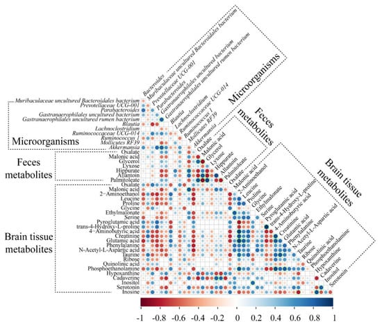 To understand the relationships between genus-level gut microorganisms and the metabolites of the brain tissue and feces, Spearman correlations were used to generate a heat map correlation matrix (|r| > 0.8) (Figure 6). The relative abundance of Gastranaerophilales_uncultured bacteria in feces was positively correlated with the relative abundances of Gastranaerophilales_uncultured rumen bacteria (r = 0.82) and Akkermansia (r = 0.82). The levels of 4-hydroxy-l-proline in the brain tissue correlated positively with the level of pyroglutamic acid in the brain tissue (r = 0.98). Inosine levels in brain tissue were positively correlated with hypoxanthine levels (r = 0.87). Palmitoleate levels in feces were positively correlated with oxalate (r = 0.86) and glycerol (r = 0.92) levels. Brain tissue taurine levels were positively correlated with the levels of creatinine in the brain tissue (r = 0.87). Brain tissue ethanolamine levels correlated positively with brain tissue creatinine levels and glutamic acid (r = 0.94) but negatively with the levels of pyroglutamic acid (r = −0.82) in brain tissue.