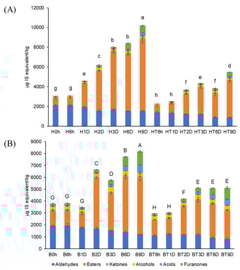 Sum of volatile compounds in (A) half-red and (B) bright-red strawberries stored at 10 °C for 9 d (H: half-red, B: bright-red, T: CO2-treated, h: hours, D: days). Lowercase and capital letters indicate significant difference for half-red and bright-red strawberries, respectively (p < 0.05).