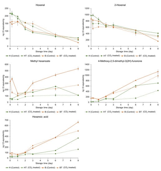 The 4-methoxy-2,5-dimethyl-3(2H)-furanone concentration of bright-red strawberries (B0h, 156 µg/kg) was 7.8-fold higher than that of half-red strawberries (H0h, 20 µg/kg). Furanones, such as 2,5-dimethyl-4-hydroxy-3(2H)-furanone and 4-methoxy-2,5-dimethyl-3(2H)-furanone, are known as characteristic volatile compounds of strawberry []. However, 2,5-dimethyl-4-hydroxy-3(2H)-furanone was not detected in the ‘Seolhyang’ strawberry. The concentration of 4-methoxy-2,5-dimethyl-3(2H)-furanone of half-red strawberries (H0h, 20 µg/kg) increased 35.6-folds after 9 d of storage (H9D, 711 µg/kg). The concentration of 4-methoxy-2,5-dimethyl-3(2H)-furanone of bright-red strawberries (B0h, 156 µg/kg) increased by 7.3-folds after 9 d storage (B9D, 1,137 µg/kg). For the CO2 treatment groups, the 4-methoxy-2,5-dimethyl-3(2H)-furanone concentrations also increased but were lower compared to the control groups (H9D (711 µg/kg) vs. HT9D (411 µg/kg); B9D (1,137 µg/kg) vs. BT9D (985 µg/kg)). Thus, CO2 treatment may inhibit the production of 4-methoxy-2,5-dimethyl-3(2H)-furanone during storage.