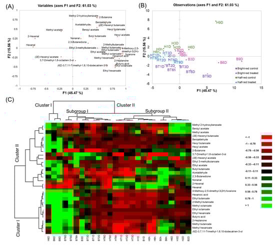 (A) Score plot, (B) loading plot of the principal components analysis, and (C) hierarchical clustering and heatmap visualization of the changes in the volatile compounds in strawberries during storage. (H: half-red, B: bright-red, T: CO2 treated, h: hours, D: days). Green and red colors presented in the heatmap indicate values above and below the mean centered and scaled expression values, respectively. Black indicates values close to the mean. The total number of features was the same as the number of determined volatiles in the strawberries (n = 30), and the “non-specific filtering” option in the XLSTAT program was not used. Missing data were estimated using the nearest-neighbor algorithm. Hierarchical clustering was conducted based on Euclidian distances.