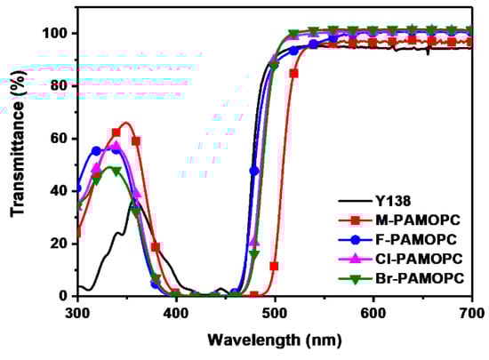 The optical data are presented in Figure 1 and Table 2. Transmittance spectra were recorded for the dyes at a concentration of 1 × 10−4 M in PGMEA, which corresponds to real application conditions used commercially. The requirement for the yellow colorant millbase is a transmittance of less than 5% at 435 nm and greater than 90% at 530 nm. As shown in Table 2, the four synthesized materials and Y138-millbase (commercial pigment) satisfy the requirements for commercial use. This requirement for the yellow colorant arises from the requirement for high color purity as well as that for low color interference in a small image-sensor pixel, and this yellow material can be added to a green millbase colorant to provide high color purity through blue-light absorption for a high-resolution image-sensor pixel. Compared with the band-edge value of 490 nm for Y138-millbase, the three synthesized compounds (F-PAMOPC, Cl-PAMOPC, and Br-PAMOPC) exhibit similar band-edge values of 493, 497, and 498 nm, respectively. The maximum absorption wavelength values are similar, and the transmittance of the four compounds is less than 0.16% at 435 nm and greater than 90% at 530 nm. These results indicate that these compounds can be incorporated into the green color material for commercial image sensors. In the case of the region between the maximum absorption and band edges, all the compounds exhibit a steep slope similar to that of the Y138-millbase; this spectral shape is related to color purity.