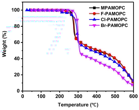 To evaluate the thermal properties of the synthesized materials, the degradation temperature (Td) corresponding to 5% weight loss was measured via TGA. Figure 2 and Table 4 show the TGA traces and data, respectively. All the compounds showed high thermal stability, with a Td greater than 250 °C. By increasing the atomic number of the halogen group of the halogenated compounds, the Td increased from 261 to 286 °C, which can be explained by the effects of the increasing molecular weight and increasing electronegativity. For comparison, M-PAMOPC, which has a methyl group, exhibited a Td of 266 °C.