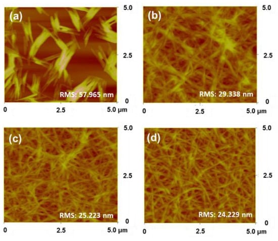 AFM images of the synthesized azo pyridone derivatives obtained after spin coating: (a) M-PAMOPC, (b) F-PAMOPC, (c) Cl-PAMOPC, and (d) Br-PAMOPC.