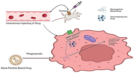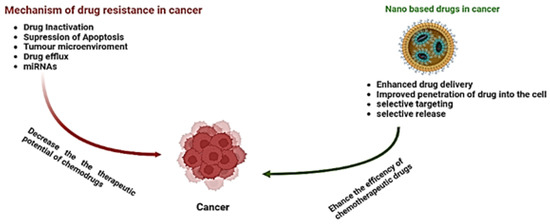 To overcome this problem, in recent years, nanotechnology-based drug dosage forms have been explored, which have shown great promise [10]. Most of these nanomedicines are heading toward clinical trials [11]. Nanotechnology has been used in medicine more and more over the past few decades, including applications for safer and more efficient tumor targeting, detection, and treatment [12,13,14,15,16,17,18,19,20]. Drug delivery methods based on nanoparticles (NPs) have demonstrated a number of benefits in the treatment of cancer, including good pharmacokinetics, accurate targeting of tumor cells, a decrease in adverse effects, and reduced drug resistance [21,22,23,24,25]. Nevertheless, nanomedicine-based formulations have some demerits, such as difficulty in physical handling due to smaller size, particle aggregation, limited drug loading, and burst release [19,20]. This review outlines the different mechanisms of cancer chemotherapy resistance and describes the different mechanisms such as the use of nanotechnology in overcoming multiple drug resistance.