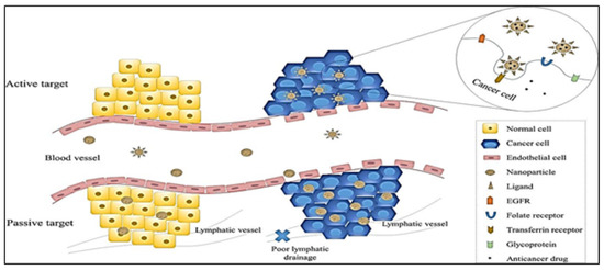 Schematic diagram of active and passive targeting of nanocarriers in cancer cells. Image reproduced with permission from reference [101].