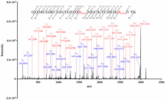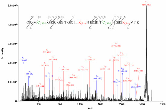The alkylation result of the isolated conopeptides showed that none of them contained free thiol. The mass difference (4.03 Da, Supplemental Material A, Figure S1) between the intact and the reduced Vi14b indicated that it contained two pairs of disulfide bridges. The Edman degradation result (Supplemental Material B, Figure S2) indicated a sequence of QQM*GR*GGTGQII*NE*KT*HGK*V**. The matrix-assisted laser desorption-ionization–time of flight-tandem mass (MALDI-TOF-MS/MS) spectrum of Vi14b was shown in Figure 1. The serial b1–b2, b6–b7, b9, b11–b12, b14, b15–b19, b21–b24, b27, y3–y11, y13–y16, y18, y20–y27 ions, combined with the key fragment ions (Table 2), indicated that its primary sequence was QQMCGRCGGTGQIIK(Ac)NECKTCHGKK(Ac)VTK, which corresponded with the Edman degradation data. This novel sequence was named Vi14b, since it was the second conotoxin discovered from C. virgo whose cysteine arrangement pattern (C-C-C-C) was framework XIV. Thereinto, two lysines (Lys, K) at the positions 15 and 25 of Vi14b were acylated since the mass addition of Lys was 42.0319, while the Lys at the positions 19, 24 and 28 were not modified. Acylation of lysine is a common PTM (posttranslational modification) among conotoxins.