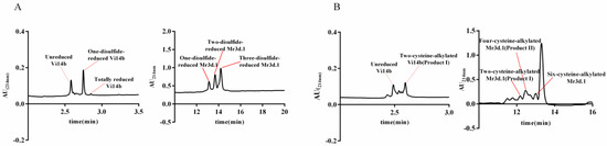 HPLC analysis of stepwise reduction by TCEP and follow-up alkylation by IAM. (A) Stepwise reduction products of Vi14b and Mr3d.1. (B) Alkylated products of stepwise-reduced Vi14b and Mr3d.1.