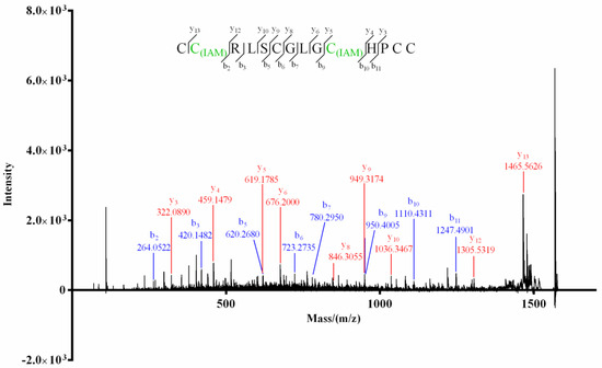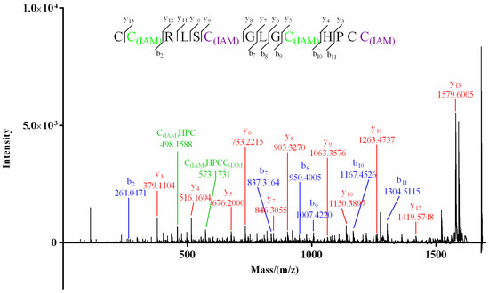For product I (Figure 3) of Mr3d.1, Cys at positions 2 and 10 (2-Cys and 10-Cys) were speculated to be IAM-labeled since the mass difference (160.0307) of y13/y12 and b10/b9 (or y5/y4) was deduced from its MS/MS spectrum (Figure 5). In the MS/MS spectrum of product II of Mr3d.1 (Figure 6), the mass difference (160.0307) of y13/y12, y9/y8, y5/y4 (or b10/b9) meant the Cys at positions 2, 7 and 10 were alkylated. The observation of ions y14/y13 and fragment ions C(IAM)HPC (m/z 498.1588) and C(IAM)HPCC(IAM) (m/z 573.1731) suggested that thiols in 1-Cys and 13-Cys were in reducing state and 14-Cys were alkylated. Herein, the disulfide linkage of Mr3d.1 was confirmed to be I-V, II-IV, III-VI.