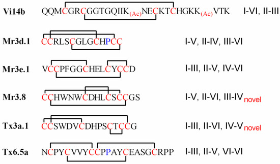 Thus, the disulfide connectivities of conotoxins Vi14b, Mr3d.1, Mr3e.1, Mr3.8, Tx3a.1 and TCP were assigned as shown in Figure 7. Generally, linkage patterns of I-V, II-IV, III-VI and I-III, II-V, IV-VI are common among the conotoxins with three pairs of disulfide bonds, while the patterns of I-V, II-VI, III-IV (such as Mr3.8) and I-III, II-VI, IV-V (such as Tx3a.1) were rarely reported and different from that previously established for the µ- and ψ-conotoxins [37]. The novel connectivity patterns could possibly cause these kinds of conotoxins, such as Tx3a.1 and Mr3.8, to present specific biological activity.