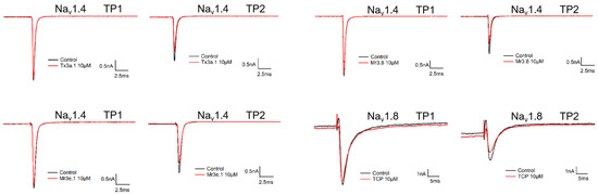 Blocking effects of Tx3a.1, Mr3.8, Mr3e.1 and TCP on Nav1.4 and Nav1.8.