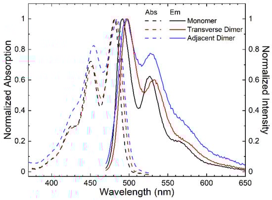 Steady-state absorption and fluorescence emission spectra of DNA-templated perylene monomer (black), transverse dimer (red) and adjacent dimer (blue) solutions. The absorption and fluorescence emission spectra are plotted with dashed and solid lines, respectively, and are normalized to their corresponding most intense absorption and fluorescence emission bands.