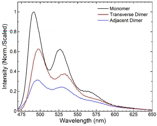 Relative fluorescence emission spectra of DNA-templated perylene monomer, transverse dimer, and adjacent dimer solutions. The fluorescence emission spectra were all scaled by dividing by the absorptance of the solution at the excitation wavelength (see, e.g., Experimental Methods). The monomer spectrum was subsequently normalized to the most intense emission feature. The transverse and adjacent dimer spectra were further scaled using the normalization factor determined for the monomer.