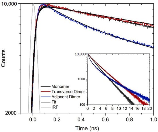 Time-resolved fluorescence spectroscopy was used to further characterize the nonradiative decay concomitant with aggregation of perylene. Figure 3 displays TCSPC measurements of the DNA-templated monomer, transverse dimer, and adjacent dimer solutions. The solutions were excited at 405 nm and fluorescence emission was detected at ~500 nm. The monomer fluorescence emission decay trace was best described by a two-exponential fit, which yielded time constants of 1.69 and 3.39 ns and associated amplitudes of 0.26 and 0.74, respectively. The amplitude-weighted average of the time constants was 2.9 ns, which is attributed to the excited-state lifetime of perylene monomer templated to DNA. In bulk acetonitrile and toluene, the fluorescence decay is reported as a single exponential decay with a lifetime of 4.2 and 3.9 ns, respectively [24,29,69]. However, once the ethynyl linker is attached to the perylene molecule, a biexponential decay was observed with fluorescence lifetimes of 1.2 and 3.3 ns with associated amplitudes 0.39 and 0.61, respectively [69]. When a weighted average is applied, the two lifetimes were reduced to 2.5 ns, which is similar to the present results. In the case of the transverse and adjacent dimers, the fluorescence emission decay traces were best described by a three-exponential fit. In both cases, a short sub-nanosecond time constant was derived, along with two longer nanosecond timescale time constants (Table 2). The amplitude associated with the short sub-nanosecond time constant was ~0.12 and 0.39 for the transverse and adjacent dimer, respectively. The presence of a short sub-nanosecond time constant indicates that an effective nonradiative decay pathway is present in both transverse and adjacent dimer solutions, and the increase in amplitude in the adjacent dimer solution is consistent with the nonradiative decay playing a larger role in the photophysics of the adjacent dimer. Additionally, taking the amplitude-weighted average of the latter two time constants results in values of ~3.8 and 3.9 ns for the long-lifetime components of the fluorescence emission decay traces of the transverse and adjacent dimer solutions, respectively. These time constants are assigned to a subpopulation of perylene monomers present in the transverse and adjacent dimer solutions, given that their amplitude-weighted average values are generally consistent with the lifetime of the perylene monomer [24,29,69].
