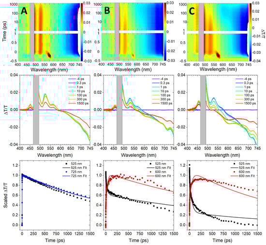 Femtosecond visible (VIS) transient absorption (TA) was used to further investigate the mechanism of nonradiative decay observed in the perylene transverse and adjacent dimer solutions. Figure 4 displays the femtosecond VIS TA of the perylene monomer, transverse dimer, and adjacent dimer solutions. The TA spectra are plotted as change in transmittance, i.e., ∆T/T. In the case of the monomer, prominent positive-amplitude signals are observed in the selected transient spectra at 525 and 565 nm, which are assigned to stimulated emission (SE) features. Additionally, intense negative-amplitude signals are observed above ~600 nm, which are assigned to excited-state absorption (ESA) features. The observation of intense ESA features above ~600 nm for the DNA-templated perylene monomer is consistent with Furube et al. who observed intense ESA features above ~560 nm in dilute solutions of unsubstituted perylene in toluene [75]. Due to limitations of the spectral range of the VIS probe continuum as well as dynamic pump scatter, positive-amplitude ground-state bleach (GSB) features were only observed weakly at ~450 nm. A fit from a global target analysis (GTA) of the monomer femtosecond VIS TA overlays the selected transient kinetics shown in Figure 4A. GTA is a form of analysis where: (i) the data are analyzed globally, i.e., the kinetics at all wavelengths are analyzed simultaneously, and (ii) a single model is chosen that is determined to be the best mathematically suited to model the data and most physically appropriate to describe the excited-state dynamics of the system [76,77]. As shown in Table 3, the analysis derives a lifetime >1.5 ns, i.e., the duration of the measurement, which is consistent with the ~2.9 ns lifetime measured via TCSPC (Table 2).