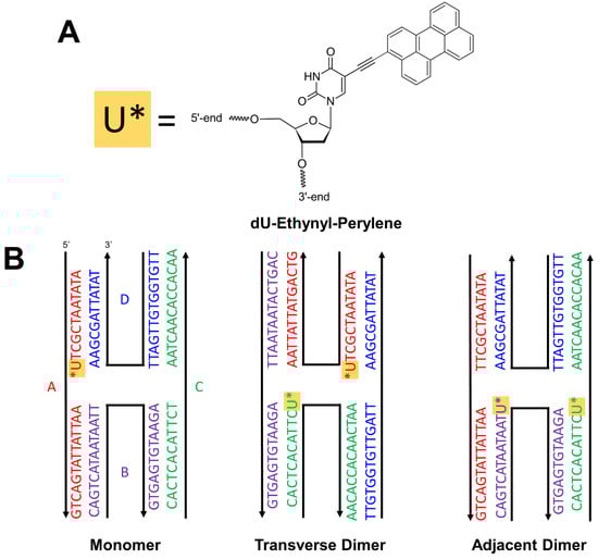 Perylene was chosen as an exemplary chromophore potentially capable of singlet fission that can be covalently attached to DNA (Scheme 1A). In DNA templating, typical linkers include dual phosphoramidite linkers [49,50,54,58,60,65], where the chromophore can be inserted as part of the oligonucleotide sequence, or a single NHS ester linker [61,63,64], where the chromophore is covalently linked to a nucleobase that is inserted as part of the oligonucleotide sequence. Here, perylene is covalently bound to the oligonucleotide via an ethynyl bond that directly connects a uracil nucleobase to a carbon atom on the short axis, i.e., the peri-side, of the molecule. Perylene was templated in the form of a monomer and two different types of dimers, i.e., transverse and adjacent, via four-armed DNA Holliday junctions (Scheme 1B). A specific oligonucleotide sequence was designed to ensure complementary pairing between nucleobases, including between uracil and adenine, as can be seen in the primary sequences displayed in Scheme 1B.