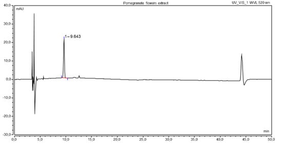 High-performance liquid chromatographic methods, using HPLC-DAD (Dionex Thermoline Fisher Scientific, Waltham, MA, USA) with gradient elution, were developed to determine anthocyanin 3,5-O-glucosides of pelargonidin. The HPLC gradient method, coupled with the DAD detector, allowed the qualitative and quantitative determination of pelargonidin-3,5-glucoside in extracts from pomegranate flowers. The determinations were carried out using a LiChrospher RP18-5 4.6 mm × 250 mm, 5 µm; the mobile phase contained 5% formic acid in water(A) and 5% formic acid in methanol (B). The gradient developed for the needs of the method assumed changes in the mobile phase according to the scheme: 0–15 min B = 15–55%, 15–20 min B = 55–65%, 20–30 min B = 65–70%, 30–40 min B = 70–75%. The method considers 10 min re-equilibration time to determine the phase equilibrium column relative to the initial injection phase. The phase flow was set to level 1 mL/min, injection for all test samples was 30 μL, and the detection was carried out at 520 nm. The chromatogram of the extract is shown in Figure 5.