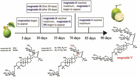 To date, a total of 71 triterpenoids have been isolated from the fruits of S. grosvenorii, including 56 cucurbitanes (Table 1), 9 nor-cucurbitanes, 1 lanostane, and 5 oleananes (Figure 3). Cucurbitadienol is a basic precursor of cucurbitane tetracyclic triterpenoids isolated from a variety plants of Cucurbitaceae. For example, secondary metabolites generated from the S. grosvenorii plant, such as mogrosides, which are the main active components of the fruits of S. grosvenorii. Most of these are sweet, accounting for about 1.19% in fresh fruits [13] and 3.82% in dried fruit powder [14]. Research on S. grosvenorii began in 1974, and American Lee Chihong firstly extracted crude mogrosides [15]. In 1977, Japanese researcher Takemoto Tsunematsu began studies to isolated pure mogrosides and deduced their corresponding chemical structures [16]. In 1983, mogrosides IV (8), V (16), and VI (18) were successfully isolated from the fruits of S. grosvenorii. Then, more than 40 analogues were obtained in succession. All these compounds have mogrol, [10-cucurbit-5-ene-3,11,24R,25-tetraol], attached to different numbers of glucose units. Based on the variation of mogrol at positions C-7, 11, and 25, mogrosides could be roughly classified into five categories. The main differences are whether there is a carbonyl group at C-7, a conformational change with a hydroxyl group attached to C-11, and whether there is a methyl group at C-25. Mogrosides are distinguished by the hydroxyl or carbonyl groups of C-11. While most mogrosides have an 11α-OH and only one has been identified as 11β-OH which is defined as 11-epimogroside V (31). Some mogrosides also have a carbonyl group at C-7 (26–29) or lose a hydroxyl group at C-25 (53–56), but no relationship has been found between their structures and pharmacological activities. 20-hydroxy-11-oxo-mogroside IA1 (47) was obtained from the unripe fruits of S. grosvenorii [17]. As shown in the research, the structure-taste relationship of the 3β-hydroxy-cucurbit-5-ene derivative glycosides depends on the number of glucose units, the oxygen function at the C-11 position of the aglycone moiety, the location of the glucose group units, and the hydroxylation of the side chain [18,19,20]. Mogroside IIE (12), mogroside IIIE (13) and mogroside III (15) are tasteless, because the basic structural requirement of at least three sugar units is not met. 11α-hydroxyl glycosides taste sweet, such as compound mogroside IVA (9) and mogroside IVE (14). In contrast, the 11β-hydroxyl glycosides are tasteless, and the 11-oxide compounds and their dehydrogenated derivatives taste bitter. It is noteworthy that the relationship between the distribution of glucose units and sweetness. Interestingly, the more sugar units, the higher the corresponding sweetness. Siamenoside I (21) has 5 glycoside units and is the sweetest triterpenoid glycoside compound isolated so far, which has a similar sweetness to mogroside V (16). Mogroside V (16) is the main compound of the fruits of S. grosvenorii with an average content over of 0.5% [21]. Mogroside V (16) and siamenoside I (21) at 1/10000 concentration were 425 and 563 times sweeter than 5% sucrose, respectively [19]. However, the number of glycoside units of mogroside IVA (9) and mogroside IVE (14) is the same as siamenoside I (21), but the sweetness is lower than siamenoside I (21). The hydroxylation of side chains could cause taste changes. For example, the bitter 11-oxo-mogrosides are sweetened by hydroxylation of the side-chain double bond with osmium tetroxide. Moreover, the mogrosides content in fruits changes during the growth and development stage. Mogrosides appeared five days after pollination, and mogroside IIE (12) is the main constituent in young fruit for the first 30 days; Mogroside III (15) began to appear after 30 days, it reached its maximum content in 55 days, then formed mogroside IV (8), mogroside IVA (9) and mogroside IVE (14). The content of mogroside IV (8) peaked at 70 days; mogroside V (16) was produced after 70 days and developed into the main sweet peaked about 85 days after pollination, and then the fruit began to mature [22]. Therefore, the best time to harvest the fruit should be 90 days after pollination (Figure 3). Besides, the fruits have a bitter taste for the first 50 days. As the growth cycle increases, the taste of fruit gradually changes from bitter to sweet [23,24]. Excepts for mogrosides, other cucurbitanes and oleanolanes are also present in this plant. For example, cucurbitanes are 5α,6α-epoxymogroside IE1 (32), 25-dehydroxy-24-oxo-mogrol (53), 3-hydroxy-25-dehydroxy-24-oxo-mogrol (54), bryogenin (55) and 10α-cucurbitadienol (56) and oleanolanes are isomultiflorenol (67), β-amyrin (68), karounidiol 3-benzoate (69), karounidiol dibenzoate (70), 5-dehydrokarounidiol dibenzoate (71). These compounds were identified from different parts of S. grosvenorii [25,26]. Furthermore, mogroseter (66) is the first cycloartane to be discovered from this plant so far, which was reported in 1992 from the leaves of S. grosvenorii [27,28]. Its structure is characterized by a lanostane-type skeleton although the methyl group at C-19 is dehydrogenated with C-9 to form a cyclopropane. Under acidic conditions, it could undergo a ring-opening reaction to produce a cucurbitane-type compound. Recently, researchers have gained new insights into siraitic acids, the methyl group at C-26 is oxidized to a carboxyl group. The forms of siraitic acid present in S. grosvenorii are divided into two kinds: one is in the form of free acid, such as siraitic acid A-F (57–58, 60–63) [29,30,31]; the other exists in the form of glycoside combined with sugar group, such as siraitic acid IIA (65), IIB (59) and IIC (64) [32]. They were isolated from the roots of S. grosvenorii. Siraitic acids are plant-specific cucurbitane compounds known as nor-triterpene acids, whereas mogrosides are triterpenoids glycosides. Nor-cucurbitacin triterpenoids