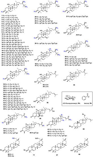 - Kasai, R. Studies on the constituents of cucurbitaceous plants. Shoyakugaku Zasshi 2008, 128, 1369–1382. [Google Scholar] [CrossRef][Green Version]