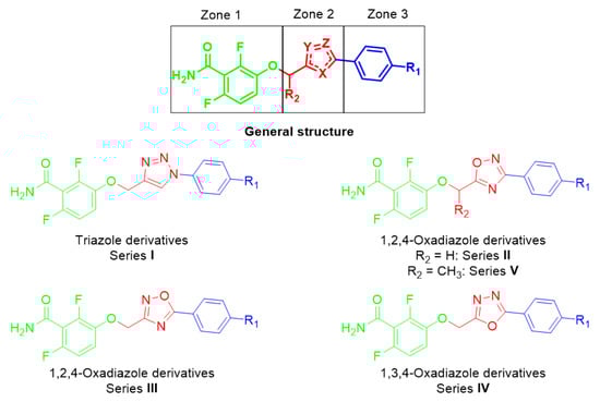 The general structure of the oxazole or isoxazole derivatives can be divided in three zone: the 2,6-difluorobenzamide moiety, a central five-member ring linked to a methylene group (substituted or not), and the substituted phenyl group (Figure 2). Among reported compounds, there has not been any systematic study of the nature of the central heterocyclic scaffold, with or without oxygen atom, or with the oxygen atom located at all possible positions of the ring. To this aim, we prepared a collection of analogs including 1,2,3-triazole derivatives, two series of 1,2,4-oxadiazoles, and one series of 1,3,4-oxadiazoles (Figure 2) which were evaluated against three S. aureus strains.