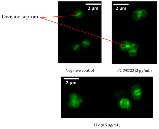 Filamentous temperature-sensitive mutant Z (FtsZ) is an essential protein for bacterial cytokinesis, a homologue to mammalian tubulin. During division, GTP-bound FtsZ polymerizes into protofilaments to form the Z-ring, a mid-cell scaffold, allowing for the recruitment and assembly of other division proteins [18,19]. Therefore, FtsZ inhibition is detrimental for the bacteria and is leading to cell death, and this protein is considered to be a valuable pharmacological target [20,21,22,23,24,25]. Since 2,6-difluorobenzamide derivatives are regularly described as FtsZ inhibitors and exert an alteration of the morphology of the bacteria by inducing aberrant localization of division septum, the action of II.c on the bacterial divisome was studied by cell wall staining. Bacteria (strain ATCC 29213) were incubated with compound II.c at the minimal inhibitory concentration for 4 h before fluorescent staining of the wall with a vancomycin-bodipy conjugate [26]. PC190723 was used as a positive control. As presented in Figure 3, dividing control bacteria are small (1 µm of diameter) with a centered division septum. On the contrary, bacteria incubated with II.c show the same morphology as bacteria incubated with PC190723, including larger overall size (approximately 1.5 µm of diameter) and wrongly localized division septum, indicating bacterial divisome targeting. Identical results were obtained with SF8300 (MRSA) S. aureus (see Figure S1, Supplementary Information). These results, added to structural similarities between II.c and described compounds, strongly suggest FtsZ inhibition.