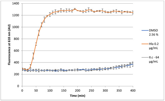Cytotoxicity was evaluated using a propidium iodide assay. Briefly, human lung adenocarcinomic A549 cells were plated on black flat 96-well plates (Greiner, Pleidelsheim, Germany) at a concentration of 0.5 × 106 cells/mL in DMEM GlutaMAX (Gibco, Waltham, MA, USA) supplemented with 10% fetal bovine serum for 24 h in a humidified atmosphere at 37 °C and 5% CO2. The medium was then removed, and fresh medium with 2.5 µg/mL of propidium iodide and tested compounds (64 µg/mL of II.c and 0.2 µg/mL for recombinant Hla) was added. Plates were incubated for 7 h at 37 °C, and the cytotoxicity induced was evaluated by measuring propidium iodide (PI) incorporation into cells exposed to toxin or compounds using a fluorescence cell sorter (Spark R, TECAN, Zürich, Switzerland). Each concentration was made as a triplicate, and mean values are displayed with standard deviation.