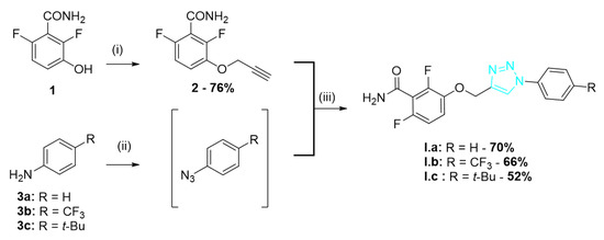 The synthetic route for the series I of triazole derivatives is shown in Scheme 1. Benzamide 1 synthetized as previously described [9] was alkylated with propargyl bromide to afford alkyne 2. Various anilines 3 were converted into the corresponding azides using tert-butylnitrite and trimethylsilyl azide [11] and were then cyclized with 2 through a click reaction using copper (I) iodide to give the triazoles I.a–c.