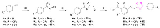 The synthetic route for the series II of 1,2,4-oxadiazoles is described in Scheme 2. The series II was obtained with various benzonitriles 4 converted to corresponding N-hydroxybenzimidamides 5 [12] and acylated with chloroacetyl chloride and cyclized to give compounds 6 [13]. Alkylation of benzamide 1 afforded the oxadiazoles II.a–c [14].