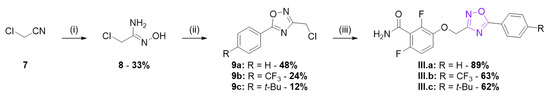 The other 1,2,4-oxadiazoles from series III were obtained as described in Scheme 3. Chloroacetonitrile was converted in 2-chloro-N-hydroxyacetimidamide 8 which was then acylated by various benzoyl chlorides and cyclized to afford compounds 9. Subsequent alkylation of benzamide 1 afforded the oxadiazoles III.a–c.