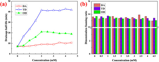 The stability of a bubble liquid film is determined more by the surface modulus than the surface tension. Surface modulus is a parameter reflecting the strength of liquid film. The larger the surface modulus, the more stable the liquid film [24]. There is no necessary relationship between surface tension and surface modulus, and a solution with low surface tension may not have a high surface modulus [25]. There are three alternatives: (1) solutions with high surface tension and low surface modulus; (2) solutions with low surface tension and low surface modulus; and (3) solutions with low surface tension and high surface modulus [25]. The surface modulus of the foaming solution was measured at different concentrations of DA, TD, and OD (Figure 2b). With increase in concentration, the surface modulus for all three fatty alcohols tended to rapidly increase at first and then to change little, but the increase in amplitude of the different fatty alcohols was very different. For DA, when the surface modulus reached 17.6 mN/m, there was little change with increase in the concentration of DA. For TD, when the surface modulus reached 367.8 mN/m, there was little change with increase in the concentration of TD. Compared with the solution without fatty alcohols, the surface modulus increased 399-fold. Among the three fatty alcohols, TD caused the greatest increase in surface modulus. For OD, when the surface modulus reached 72.8 mN/m, there was little change with increase in OD concentration. The order of surface modulus was the same as that of the drainage stability (Figure 1a) and the bubble stability (Figure in Section 2.6) (discussed further in Section 2.6).