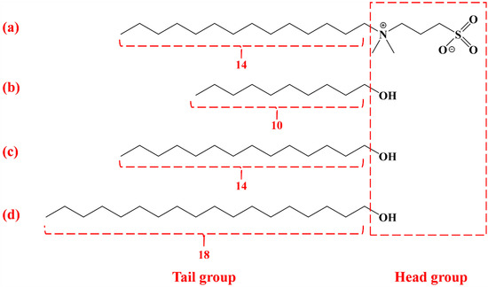 DA, TD, and OD have structures similar to the tail and head groups of DMAPS surfactants (Figure 3). However, these fatty alcohols are hardly dissolved in water due to the weak polarity of the head group [26], which limits their application. An effective method to improve the solubility of long-chain fatty alcohols is to form mixed micelles with surfactant which are then dissolved in the surfactant solution [26]. This can significantly affect the surface and bulk phase properties of the solution [27,28], such as the surface tension, surface modulus and solution viscosity (Section 2.2 and Section 2.4). DA, TD, and OD were separately dissolved in DMAPS solution containing PA at pH 1.8. The transmittance of the DMAPS solution was measured (Figure 2c). With increase in concentration, the transmittance of the solution tended first to remain constant (close to 100%) and then to decrease. However, when the transmittance of the solution began to decline, the corresponding concentration of DA, TD, and OD was different, indicating that the solubility of fatty alcohols with different chain lengths was different. The solubilities of DA, TD, and OD were 3 mM, 2.5 mm and 2 mM, respectively. Solubility decreased with increase in chain length of the fatty alcohols, showing normal chain length dependence [26]. The concentration of the betaine surfactant (DMAPS) was about 27.5 mM, which was much greater than the solubility of the fatty alcohols, so fatty alcohols are cosurfactants [27]. After the dissolution of the fatty alcohols reached saturation, change in concentration of the fatty alcohols had little effect on the surface and bulk phase properties of the DMAPS solution [26,27,28]. Therefore, the saturated fatty alcohol solutions were used for the following experiments.