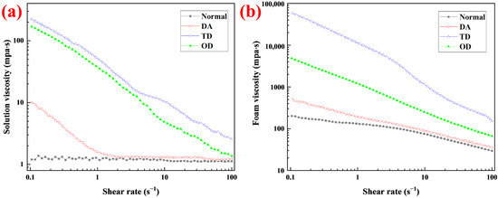 Apparent viscosity of (a) solutions and (b) foams at different shear rate. The label “Normal” represents the solution and foam without fatty alcohols.