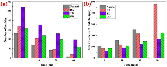 (a) number and (b) mean diameter of bubbles at different times.