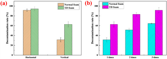 (a) Decontamination rate on horizontal and vertical surfaces. (b) Decontamination rate of normal foam and TD foam on vertical surface.