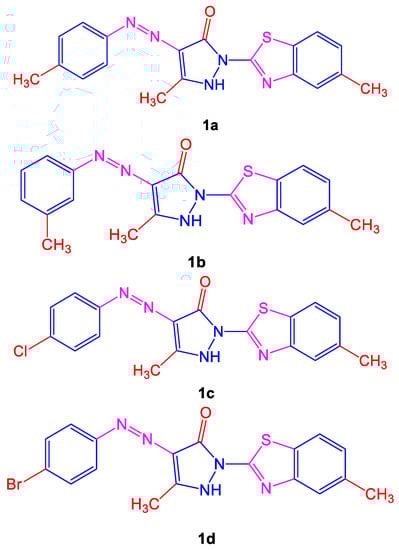 Different symptoms such as respiratory issues, long-term coughs, and tuberculosis are treated by various plants in African and Asian countries. Many anti-tubercular drugs, with toxicity and side effects, are still used to treat tuberculosis. For treating M. tuberculosis, the synthesis of azo compounds was monitored and showed anti-tubercular activity. Maximum activity was shown by compounds 5-methyl-2-(5-methylbenzo[d]thiazol-2-yl)-4-(p-tolyldiazenyl)-1H-pyrazol-3(2H)-one (1a) and 5-methyl-2-(5-methylbenzo[d]thiazol-2-yl)-4-(m-tolyldiazenyl)-1H-pyrazol-3(2H)-one (1b) when compared to the copounds 4-((4-chlorophenyl)diazenyl)-5-methyl-2-(5-methylbenzo[d]thiazol-2-yl)-1H-pyrazol-3(2H)-one (1c) and 4-((4-bromophenyl)diazenyl)-5-methyl-2-(5-methylbenzo[d]-thiazol-2-yl)-1H-pyrazol-3(2H)-one (1d) shown below in Figure 1, correspondingly. A previous study shows that the presence of a side chain to an azo dye along with a phenyl group substituent and a significantly enhanced electron-donating group ultimately decreased the growth of bacteria [5].