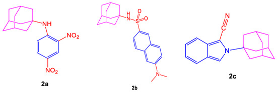 Disordered physiological processes such as neurodegenerative disorders are studied by reactive nitrogen and oxygen species or heterocyclic compounds [59]. Neuroprotection involves an option of antioxidant therapy, so antioxidants can be described as compounds capable of searching for free radicals. Dicsussing specific fluorescent heterocycles shown in Figure 2 such as (3s,5s,7s)-N-(2,4-dinitrophenyl)adamantan-1-amine (2a), N-((3s,5s,7s)-adamantan-1-yl)-6-(dimethylamino)-naphthalene-2-sulfonamide (2b), 2-(adamantan-1-yl)-2H-isoindole-1-carbonitrile (2c), provide us a guide to the pharmacological industry as they are of great interest as antioxidant agents [60].