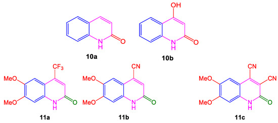 The importance of quinolines is increasing due to their renowned fluorescent compounds and their use as fluorescence probes in chemosensors [79]. Some compounds show eminent fluorescent properties such as substituted 4-trifluoromethylquinolones (11a), 4-cyanoquinolones (11b), and 3,4-dicyanoquinolones (11c) which are derived from quinolin-2-one (10a) and 4-hydroxyquinolin-2-ones (10b) as shown below in Figure 7, respectively [80].