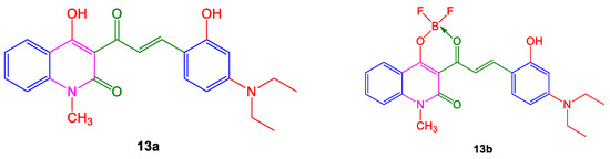 Along with the above-mentioned applications, quinoline derivatives were also used to detect metal ions as fluorescent probes. Protein detection was considered an essential function performed by two compounds (13a–b) of 4-hydroxyquinolin-2-one dyes (Figure 9), which contained 4-diethylamino-2-hydroxyphenyl substituents and displayed high emission with bright fluorescence [82]. The role of these quinoline and quinolone derivatives as fluorescent markers, optical brighteners, luminophores, UV absorbers, and colorants for most biomolecules was determined [83].