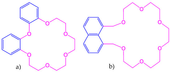 Several significant functions such as enhancement of crown ether–naphthalene derivatives by alkali metal ions and fluorescence quenching were reported by Sousa, but the reason for this fluorescence enhancement between 1,8-naphtho-21-crown-6(15a) and K+ (or Rb+) remained unidentified, with their structures shown in Figure 11. This fluorescence enhancement in dibenzo-18-crown-6(15b) in alcohol involved the chelation of alkali metal cations and depended upon their atomic number M+. In addition, higher temperatures (300 K) and smaller viscosity were also found to be responsible for fluorescence enhancement. The main reason for this enhancement was unknown, but experiments showed that the formation of planar or semi-planar structures in these types of complexes with a large ring size was comparatively harder to accomplish [86]. Physical chemistry and biochemistry are two major fields in which these studies hold very important places.