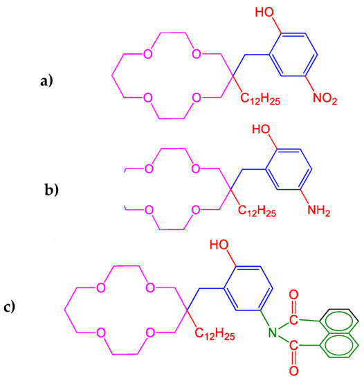 Lithium-ion extraction was attainable by some vital chromogenic 14-crown-4 (1,4,8,11-tetraoxacyclotetradecane) derivatives including crown p-nitrophenol 17a and crown p-aminophenol 17b type chromophores shown below in Figure 13. Extraction, fluorimetry, and spectrophotometry of lithium was achieved by a new fluorescent derivative 14-crown-4, 6-dodecyl-6-[2-hydroxy-5-(l,7-naphthalenedi-carboximido)benzyl]-1,4,8,11-tetraoxacyclotetradecane 17c, which contained a p-(1,8-naphthalenedicarboximido) phenol moiety. Thus, the lithium-ion was selectively determined for extraction, fluorimetry, and spectrophotometry by this new 14-crown-4 derivative [88].